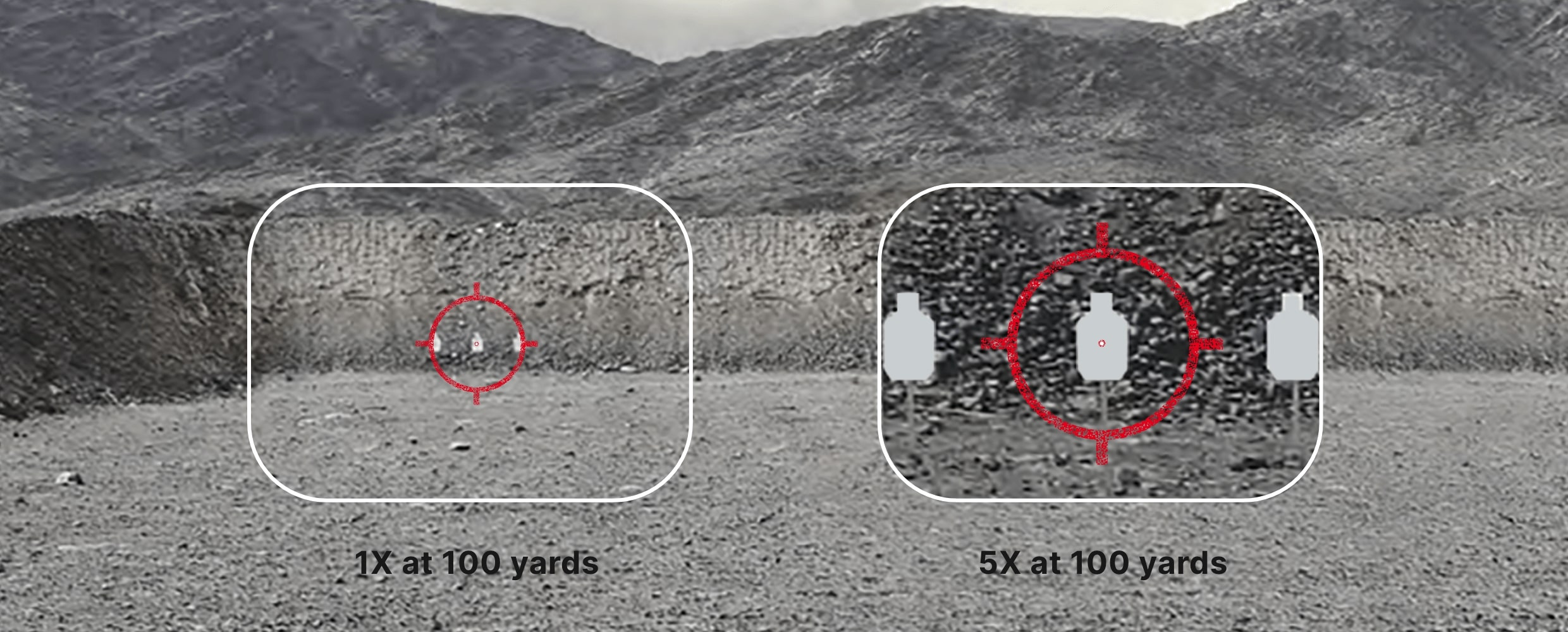 EOTech magnifiers are designed to be used behind an EOTech Holographic Weapon Sight (HWS). The magnifiers can be mounted directly behind the HWS. Simply switch the magnifiers out of the way for quick 1X targeting. When used with HWS Models 518, 558 and EXPS (with side button interface), the user can easily operate the sight even with the magnifier engaged.